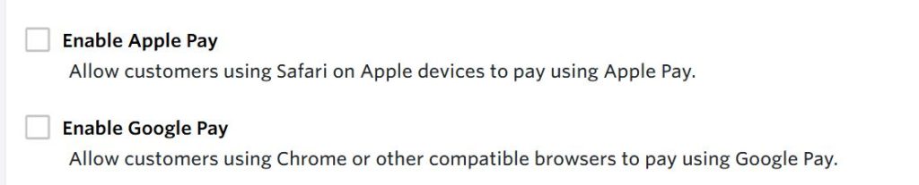 Through partnering with Stripe, we have enabled the ability to take Apple Pay and Google Pay. They are now available to toggle on in site settings.